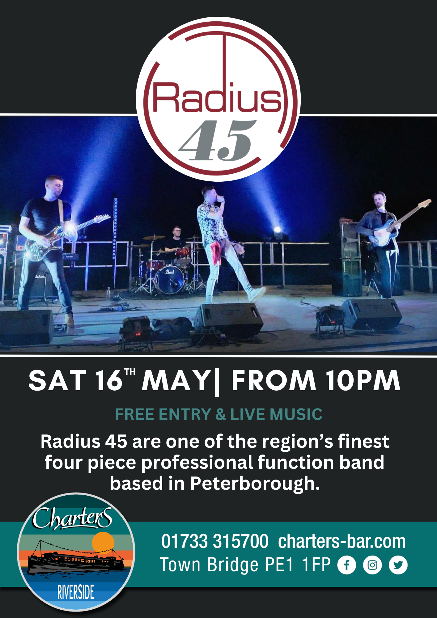 LIVE MUSIC & FREE ENTRY from 10pm Radius 45 are one of the region’s finest four piece professional function band…